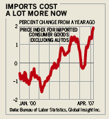 尽管整体经济在第一季度表现不佳,但消费者的需求表现依然强劲,第二季度的支出虽然放缓,但似乎并没有严重问题。将零售销售在四月份的疲软表现归咎于住房和次级贷款问题是方便的,四月份的零售销售较三月份下降了0.2%。然而,更高的油价似乎是主要原因,加上复活节提前,使得销售集中在三月份。请注意,三月份的收入增长了1%,而在五月初,失业救济申请人数降至30万以下,这一水平与强劲的就业增长相一致。