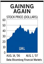 联合航空的母公司UAL(UAUA)在七月发布了第二季度的收益,出乎意料地超出了华尔街的预测。另一个惊喜是,在UAL于2006年2月走出破产后,尽管油价高企、竞争加剧以及公众对航空公司频繁取消航班和延误的抗议,股票却反弹了。股票从2月份的21上涨到2007年7月23日的49,即市场暴跌的前一天。分析师认为,目前股价为44.44的股票将在强劲的收入增长和持续的成本削减下上涨至52-58。另一个可能推动股价上涨的因素是私募股权的兴趣。
