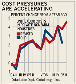此外,最新生产力数据的通胀影响几乎不乐观。劳工部对过去三年的修订显示,最近几年生产力增长的放缓比早期数据所揭示的更为严重。它们还显示,单位劳动成本——工资和福利被生产力增长抵消——急剧加速,达到了近七年来最快的年增速(图表)。这种加速给企业带来了更大的压力,迫使它们提高价格。