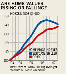 这是因为美联储估算中使用的房价指标来自联邦住房企业监管办公室(OFHEO),不包括大于417,000美元的巨额抵押贷款房屋或次级贷款房屋。第二季度的OFHEO房价指数比去年上涨了2.6%,而标准普尔(MHP)凯斯-希勒指数,虽然概念相似但包括所有类型抵押贷款的房屋,下降了3.2%。因此,房地产崩溃可能对资产负债表的影响比官方数据所显示的要大。