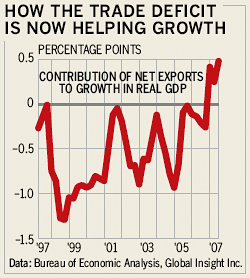 在公司工资在八月份首次下降四年的消息传出后,预测者们提高了美国经济衰退的可能性。但经济可能还有一张王牌。对经济增长来说,外贸变得越来越重要。在过去的一年里,美国贸易赤字的缩小为14年来的经济增长做出了最大的贡献,这一趋势可能会持续到2008年。
