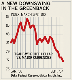 进入2007年,自2002年初以来,美元对所有货币贬值了18%,而自今年年初以来又下跌了4.1%。两个因素倾向于增加美国以外资产的吸引力,预示着进一步贬值:国外的增长前景继续看起来比美国更为光明,而美联储似乎准备降低利率,而其他中央银行则处于观望状态。而海外的前景则是随着信贷危机的缓解而进一步增长。