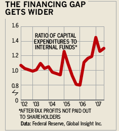 更丰厚的支付正在造成融资缺口。也就是说,资本支出超过了内部产生的资金,增加了借款的需求。在2005年,内部资金,即未支付给股东的税后利润,足以覆盖投资。现在,股息增加了,资本支出比内部资金多出30%。