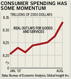 在8月,当信贷危机的严重性显现时,消费者支出出乎意料地坚挺。经过价格变化调整的商品和服务的实际支出比7月增长了0.6%,与去年7月和10月的表现相当,成为两年来最佳的月度表现。在9月,周度零售调查显示购买力保持稳定;主要的抱怨是异常温暖的天气抑制了秋季服装的销售。而汽车销售则高于预期,年化率为1620万辆,略低于8月的1630万辆。销售实际上比6月和7月的增速有所改善。