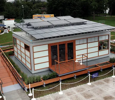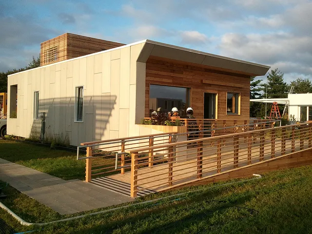 今年的几座房屋——所有这些房屋都是在大约一周内建成,建设成本为250,000美元——都是为密集城市环境设计的。其中一座由帕森斯和史蒂文斯理工学院的学生在纽约建造,赛后将被移植到阿纳科斯蒂亚河对岸,为一位单身母亲和她的三个小孩提供住所,位于华盛顿东北部。