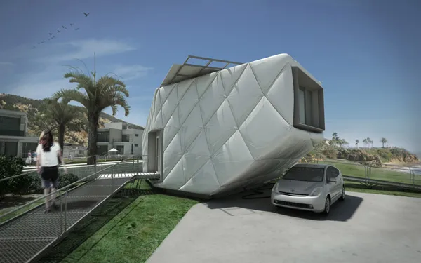 在全国各地,洛杉矶的问题是城市扩张而非密度,来自 南加州建筑学院和加州理工学院 的学生们开发了可能是比赛中外观最奇特的房屋。这座房子用乙烯基绝缘材料包裹,而不是用它来衬里,以最大化内部空间。洛杉矶市的规定还要求每个住宅必须有非街道停车位,因此学生们在房屋的一面倾斜墙下藏了一个停车位,增加了其未来感。