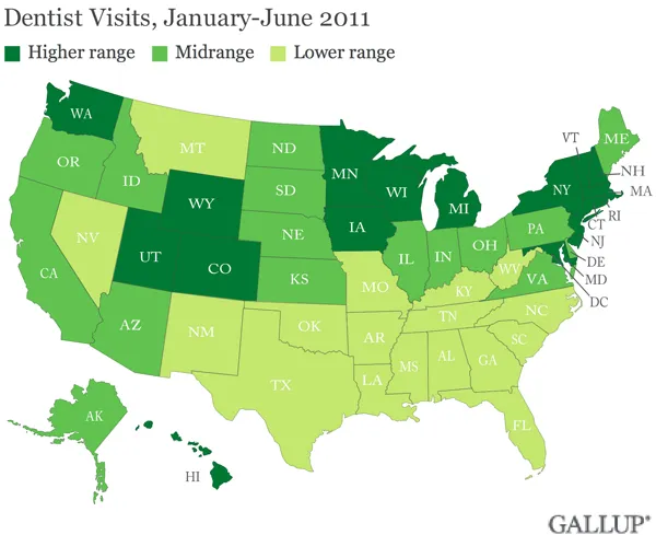 这些数据来源于一个大规模的数据库,包含约177,000次访谈,作为持续进行的 盖洛普-健康之路幸福指数的一部分,下面的地图显示了美国50个州在看牙医频率方面的比较。各州之间的差异相当大。马萨诸塞州和康涅狄格州的人在过去12个月中更有可能去看牙医,而南方的人则不然。盖洛普指出,牙医办公室的访问往往与收入水平和健康保险覆盖率相关。那些居民最有可能去看牙医的州,其无保险率在全国范围内是最低的。