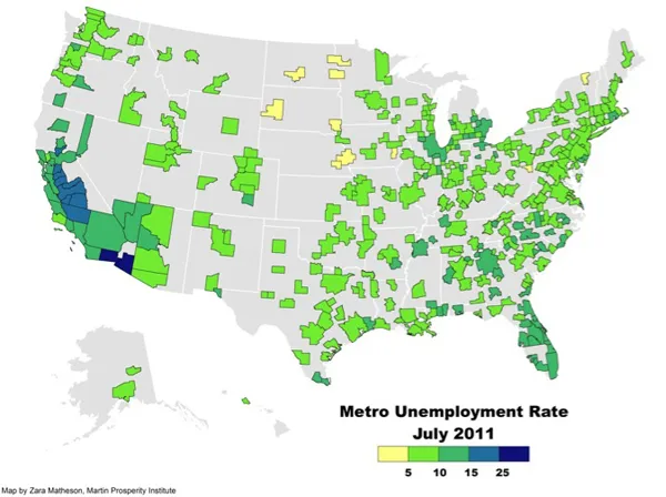 除了国家报告,每个月劳工统计局还跟踪372个美国大都市区的失业率(见下图)。好消息是,从2010年7月到2011年7月,372个大都市区中有257个的失业率下降。但失业的地理分布仍然极其不均。加利福尼亚州的埃尔中心和亚利桑那州的尤马失业率高达惊人的30%——大约是比斯马克(3%)、北达科他州的法argo(3.7%)和内布拉斯加州的林肯(3.8%)这几个失业率最低的大都市区的十倍。仅看大型大都市(人口在一百万以上),加利福尼亚州的河滨-圣贝纳迪诺-安大略的失业率接近15%(14.7%),而大底特律的失业率为14.1%,几乎是俄克拉荷马城(5.5%)和华盛顿特区(6%)的三倍。