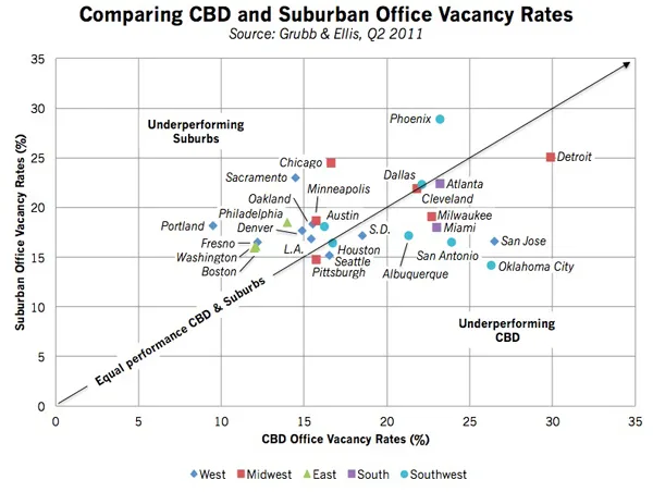 对2011年第二季度27个大都市办公市场样本数据的审查反映了这一说法:CBD的空置率在大约与郊区空置率较高的市场数量相当的市场中更高。由于各地办公空间普遍过剩,几乎没有新的建设,因此空置率可能是不同大都市区域相对健康状况的最佳指标。