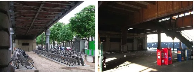 许多关于自行车共享站的细节在2009年的规划报告中有详细说明。除了宽阔的人行道,选址还应利用路缘扩展、开放式前沿以及高架桥、立交桥和高速公路下的空间。例如,报告建议考虑金融区FDR Drive下的空间,或者大中央附近的公园大道下的立交桥,以便为更大的站点提供空间(左图,巴黎一个位于立交桥下的站点;右图,125街的Metro North站下的潜在纽约市自行车共享位置,这将超出第一阶段的范围):