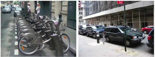 在单个站点的层面上,共享单车停放位受到与任何街道家具相同的法规约束:人行道通行、距离消防栓的距离、符合历史区域的要求等。成功设置的其他一般指导方针包括将站点设置在人行道宽阔的地方,以免妨碍行人流动;靠近主要文化和旅游地点以及公园和公共空间,以吸引休闲骑行者;并提供足够的站点可见性,以便共享单车用户不必寻找他们知道就在附近的站点。位于街道上的站点应远离交通,并理想地设置在消防栓旁边(左侧是巴黎的一个街道站;右侧是潜在的纽约对应站):