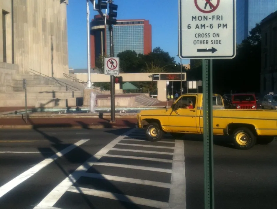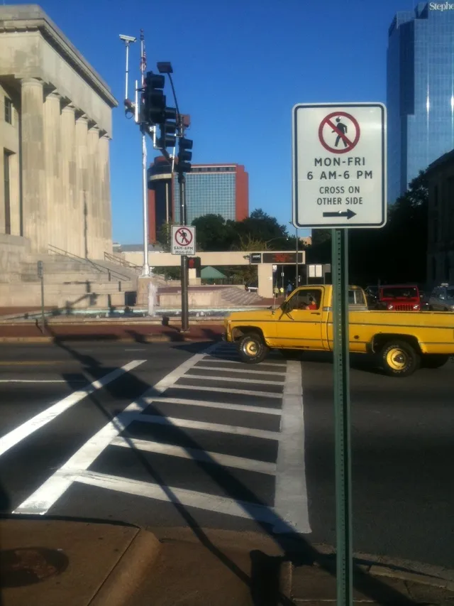 来自 MoveArkansas不要让路上的大画的斑马线或电子行人信号欺骗你:如果是在工作日的早上6点到晚上6点之间,你不允许在阿肯色州小石城的马克汉姆街北侧穿过百老汇。这交叉口有市政厅、一个2600个座位的礼堂,以及一个旧州议会大厦改建的历史博物馆,位于四个角落中的三个。并不是一个行人荒漠。由于这个城市标志,也并不友好,来自优秀的 MoveArkansas 博客: