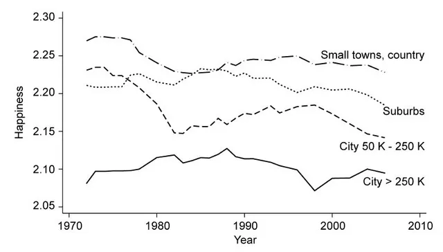 研究人员探讨了一些城市不幸福的理论基础——经常提到路易斯·维尔特1938年的论文,“城市主义作为一种生活方式,”[PDF] 其中提到“亲密个人关系的相对缺乏”是城市居民幸福感较低的许多潜在原因之一——然后转向最近的数据。他们的主要资源是自1972年以来定期收集的广泛社会信息的综合调查。通过将对G.S.S.幸福感问题的回答与居住地的数据进行映射,研究人员发现,在1972年至2008年之间,“幸福感在全国最大的城市中最低,而在小镇和乡村地区始终处于最高水平”: