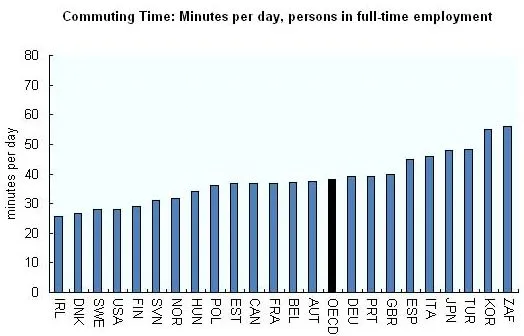 路透社本月,经济合作与发展组织发布了一项关于幸福感的 新国际调查 的结果。在《 纽约时报 的 Economix 博客上, 凯瑟琳·兰佩尔指出 了来自 O.E.C.D. 数据的一个有趣发现:美国的通勤时间与世界其他地方相比相当低。调查显示,美国工人的通勤时间为每天 28 分钟。这比整体平均通勤时间少整整 10 分钟,只有南非最差排名的一半,并且比除了三个发达国家以外的所有国家的工作通勤时间都要短: