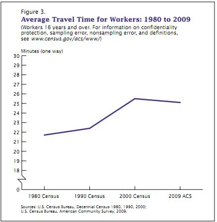 这个发现至少可以说有点令人惊讶。一般的观点认为,美国人的通勤相当 糟糕,主要是由于城市地区的扩张。这似乎也与最近发布的 美国人口普查局的美国社区调查 [PDF] 的数据直接相悖。这些数字 — 兰佩尔几周前也提到过 — 给出了大约 25 分钟的“单程”平均通勤时间,或接近每天 50 分钟: