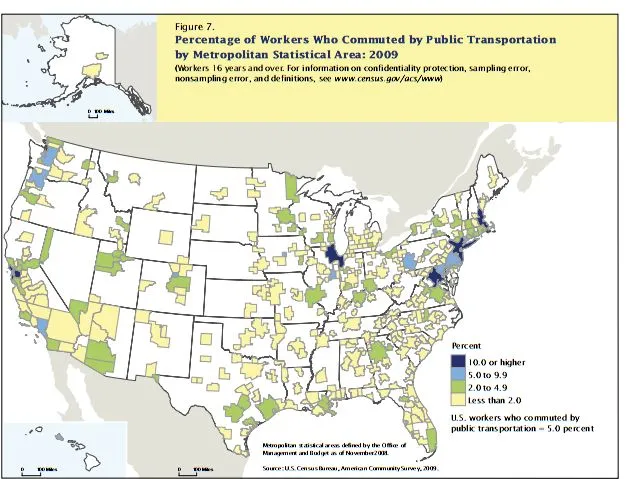 普卢默指出的第二个复杂因素是汽车和公共交通通勤被混为一谈。这在许多方面都是个问题。首先,汽车通勤和公共交通通勤的幸福感可能不同,因为后者没有在交通中驾驶的压力。此外,根据人口普查,平均通勤时间是驾驶时间的两倍。这有点误导,回到城市规模的警告,因为大多数长通勤发生在大城市,而可比的汽车通勤时间也比全国平均水平更长: