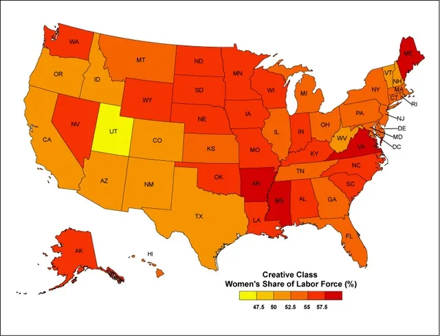 名单的顶部可能会让人感到惊讶。密西西比州位居第一,女性占创意阶层的58.9%。其次是缅因州(58.7%)、阿肯色州(58.2%)、弗吉尼亚州(57.7%)和路易斯安那州(57.4%)。名单的底部是犹他州(45.7%)、科罗拉多州(50.3%)、西弗吉尼亚州(50.5%)、加利福尼亚州(50.7%)和佛蒙特州(51.4%)。