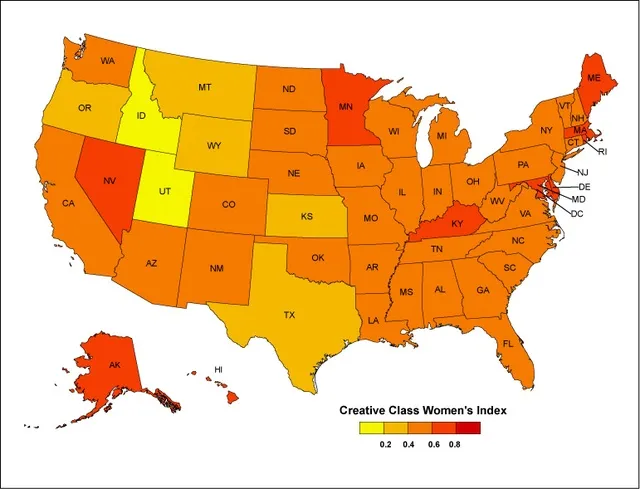 再次,华盛顿特区以0.82的指数得分位居榜首。它是女性整体和创意阶层女性的最佳地点。内华达州以0.78的指数得分位居第二。马里兰州第三(0.69),罗德岛第四(0.67),阿拉斯加突然跃升至第五位(0.66)。有趣的是,四个在整体“女性收入指数”中得分较高的州——马萨诸塞州、新墨西哥州、华盛顿州和康涅狄格州——在“创意阶层女性收入指数”中显著下降。犹他州在创意阶层女性中得分最低,仅为0.12。爱达荷州(0.15)、蒙大拿州(0.27)和堪萨斯州(0.32)位列榜单底部。
