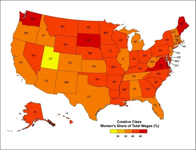 我们现在来看看女性在创意阶层总工资中的份额。南达科他州位居榜首,女性工资占总工资的46.6%,其次是缅因州(46.3%)。华盛顿和弗吉尼亚州的份额均超过45%,接下来是哥伦比亚特区(44.7%)和北达科他州(44.1%)。榜单底部是犹他州,这是唯一一个女性工资占总工资不到30%的州。康涅狄格州以36.3%紧随其后,之后是爱达荷州(36.7%)、科罗拉多州(37.3%)和德克萨斯州(37.7%)。