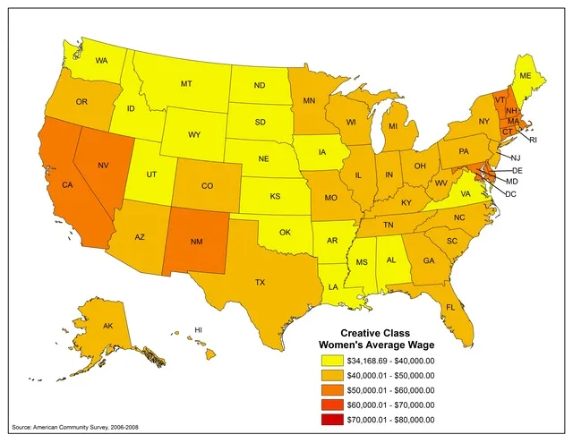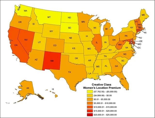 下一张地图展示了工资的模式。哥伦比亚特区在创意阶层女性的工资中名列第一($70,395),其次是新墨西哥州($59,476)、马里兰州($58,848)、加利福尼亚州($56,876)和康涅狄格州($56,803)。总共有十个州的平均工资超过$50,000,包括内华达州($54,630)、马萨诸塞州($53,645)、佛蒙特州($52,757)、特拉华州($50,929)和新罕布什尔州($50,679)。名单的底部是蒙大拿州($34,169)和北达科他州($34,448)。南达科他州($35,018)、爱达荷州($35,286)、犹他州($35,872)和怀俄明州($35,874)也是创意阶层女性的收入大约是华盛顿的一半的州。底部和顶部表现者之间的比例对于所有女性和创意阶层女性大致相同,顶部的收入大约是底部的两倍。