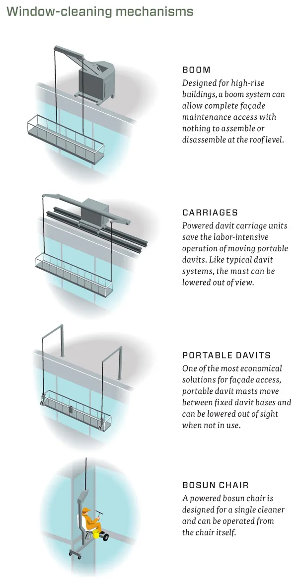 企鹅出版社摩天大楼的外立面在窗户可以打开时可以说是更简单且更容易清洁。实际上,1950年之前的外立面清洁主要意味着洗窗,这项工作由一支专门的工人团队完成,他们会把自己绑在皮革安全带上,并将自己挂在摩天大楼窗户的侧面。尽管他们站立的窗台很小,但他们感觉相对安全:如果一个钩子失效,他们会依靠另一个钩子悬挂着。但随着1950年代玻璃幕墙建筑的出现,窗户实际上成为了建筑的外立面。由于这个外立面是固定的——即它不打开——洗窗需要从外部进入,因此变得复杂得多。为了方便窗户清洁工的外部进入,建筑必须建有平屋顶,以容纳固定或移动的洗窗设备。开发了多种机制,以允许洗窗平台从建筑屋顶上的轨道或轨道悬挂,并根据操作员的意愿上下移动。
