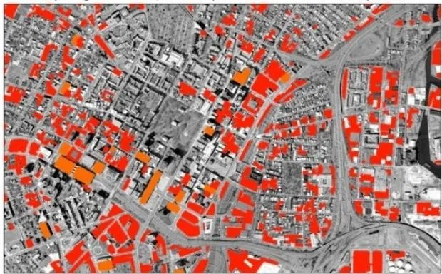 他们从大学地图图书馆收集了历史航空照片,以及来自美国地质调查局的较新图像。这些照片中最早的可以追溯到1950年代,揭示了整个城市被停车场慢慢吞噬的历史。这些照片还使麦卡希尔和加里克能够得出每个城镇停车位的相当精确的数字。