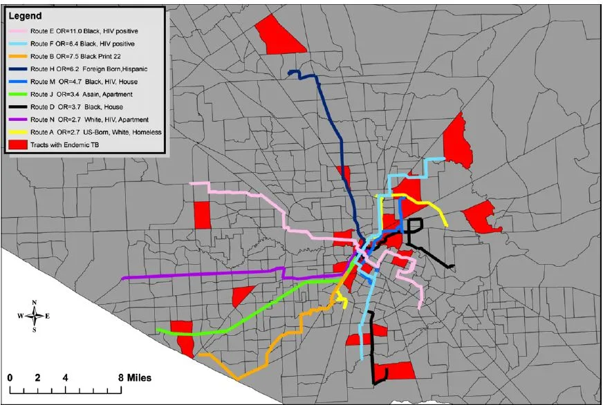 这一发现令研究人员非常感兴趣,以至于他们专门进行了 一项独立的研究,将公共交通作为休斯顿地区结核病的风险因素。这一次,他们确认了乘车时间与结核病发生率之间的“正线性关系”,并且还确定了10条特定的公交线路——包括一条服务于市医院的线路——在这些线路上,结核病病例似乎聚集: