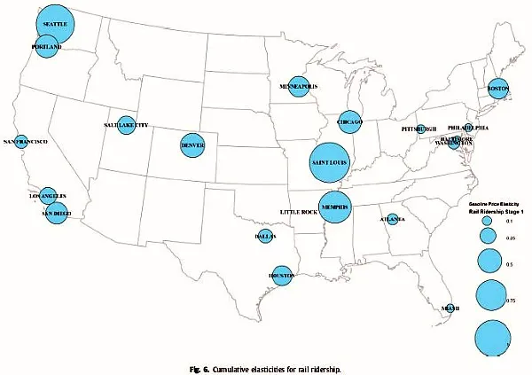 (技术附注:弹性是双向的——因此燃料成本的下降会导致相反方向的变化,远离公共交通——但这里重要的是汽油价格与公共交通乘客之间的直接联系。Lane确实发现了一些负弹性,意味着燃料成本与乘客人数之间存在反向关系,但这些情况很少见,并可能是数学模型的局限性。)