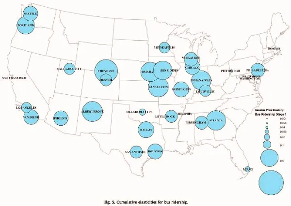 以亚特兰大的公交乘客为例。Lane发现了三个在三个不同时间滞后的显著行为弹性。第一个发生在0个月(或大致与燃料涨价同时),公交乘客人数大约增长了20%。第二个在6个月时,公交乘客人数增长了32%,第三个在11个月时,增长了12%。因此,在大约一年的时间里,亚特兰大的燃料成本大幅上涨导致公交乘客人数增加了约64%。