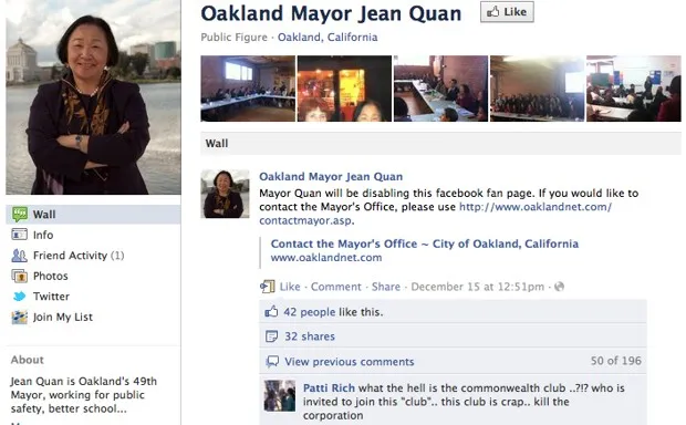 脸书加利福尼亚州奥克兰市市长简·宽正在听取大量意见。还有满满的电子邮件收件箱。以及脸书墙上的评论。她在处理城市占领抗议者方面的领导引起了国际关注,因为营地被拆除,抗议者与警察之间的冲突导致许多人受伤——包括 一名伊拉克战争老兵的著名颅骨骨折。