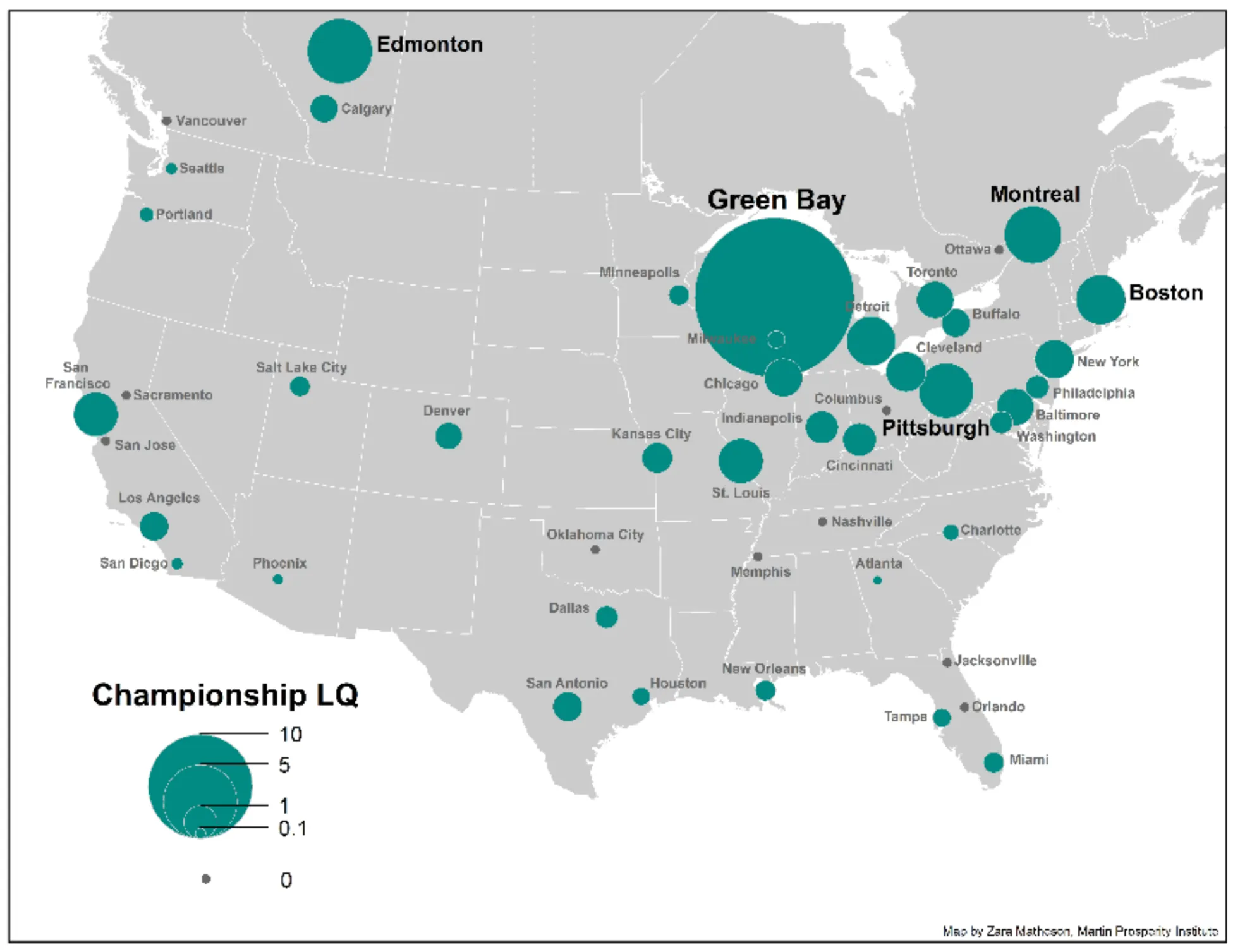 上面的地图,由我的 MPI 同事扎拉·马西森绘制,绘制了各大城市的职业体育冠军总数。大纽约以59个总冠军位居榜首。波士顿以33个排名第二。芝加哥以29个排名第三。蒙特利尔以24个冠军排名第四;洛杉矶以23个排名第五,底特律以22个排名第六。格林贝以13个冠军(超过华盛顿特区、费城、迈阿密、达拉斯、明尼阿波利斯和凤凰城),显然表现超出其规模。