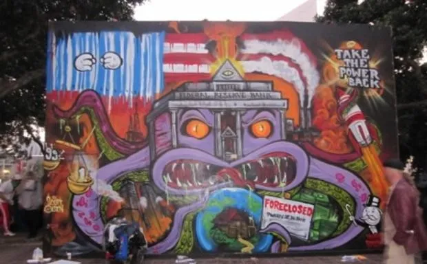 彭博社城市实验室范德比尔特租赁挣扎中的纽约市神学院以扩展校园纽约市市长埃里克·亚当斯因联邦腐败调查被起诉新泽西交通局,阿姆特拉克列车在纽约市附近出轨后延误纽约市养老金投资于前审计长公司管理的基金壁画的一侧描绘了联邦储备银行作为一只巨大的章鱼,贪婪地从被止赎的房屋中抓取现金,同时呼吁观众“夺回权力”。