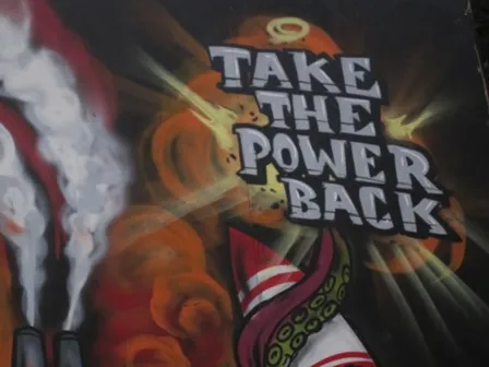 这幅巨大的四面壁画,画在为保护公园喷泉免受破坏而竖起的胶合板上,正在等待一位看护者,因为文化事务部在一位保护者的密切监督下将其移除。这幅壁画不仅仅是抗议者视角的视觉表现。它的物理创作也呼应了这一运动,多个匿名艺术家为这件作品做出了贡献。
