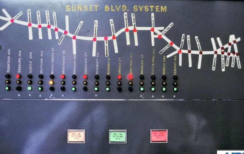 洛杉矶的交通信号操作可以追溯到1924年,当时该市从一个中央站操作31个Acme交通信号灯——“世界上第一个已知的交通控制中心,”市官约翰·费舍尔在一篇关于ATSAC系统的回顾中[PDF]中写道,该文发表于2011年7月的I.T.E. Journal,这是交通工程师协会的出版物。该系统很快就变得过时,1960年出现的另一个系统也是如此(见下文),可以在这份关于ATSAC的幻灯片中找到,由费舍尔创建: