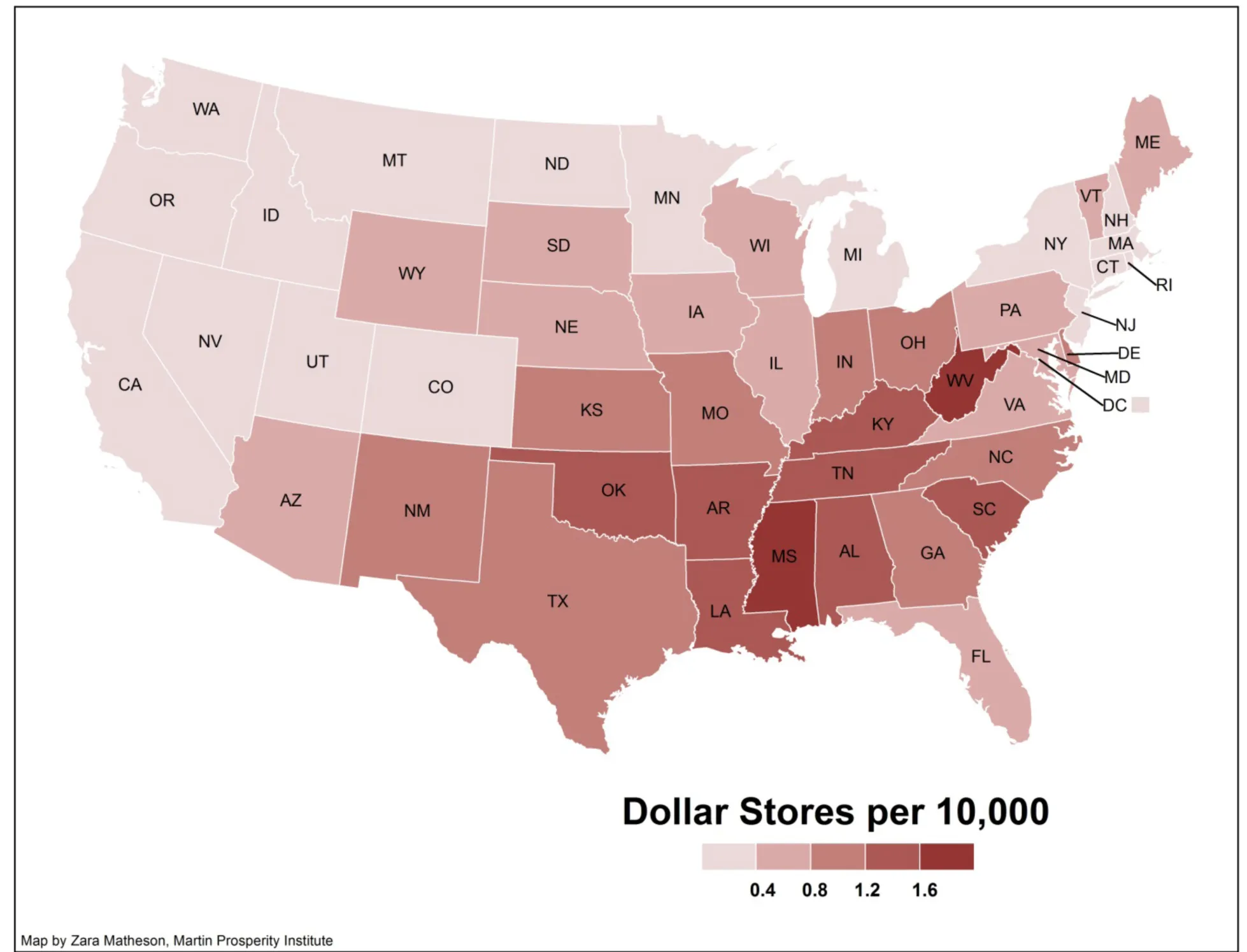 上面的地图由MPI的Zara Matheson制作,显示每万人中美元商店的分布。西弗吉尼亚州、密西西比州、阿拉巴马州和路易斯安那州的美元商店集中度最高。* 确实,可以辨别出一条“美元商店带”,从北方的俄亥俄州和印第安纳州,穿过肯塔基州和田纳西州,延伸到墨 Gulf Coast。