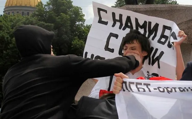 顶部照片:一名男子在2011年6月的同性恋骄傲游行中袭击了一名同性恋权利活动家,该游行未获得市政府的批准,地点在圣彼得堡。路透社/俄罗斯记者