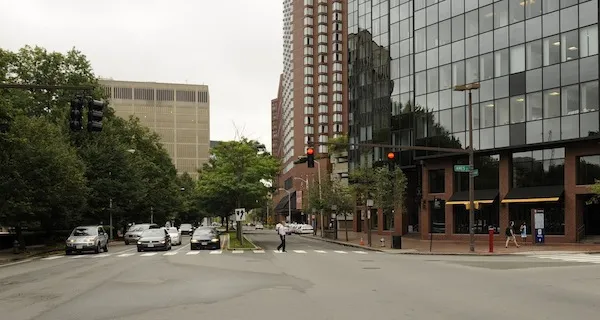 这听起来有些违反直觉,但作为可步行、以交通为导向的社区一部分的高楼实际上可以帮助缓解拥堵。而且这些地方没有理由显得丑陋。那些最好的邻居的高楼在街面上并不会感觉像高楼。它们被生动的零售、联排别墅的前面或诱人的公共空间所包围。以马萨诸塞州剑桥的肯德尔广场这样的交叉口为例: