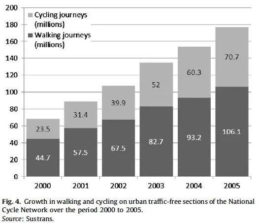 牛津布鲁克大学的Tim Jones研究了国家自行车网络——一个由Sustrans建立的13,000英里长的路径和车道系统,声称距离一半英国人口的步行距离在一英里之内。虽然该系统存在于公路和非公路上,但在城市地区与机动车隔离的无交通路径是最受欢迎的,承载了网络中三分之二的自行车出行。