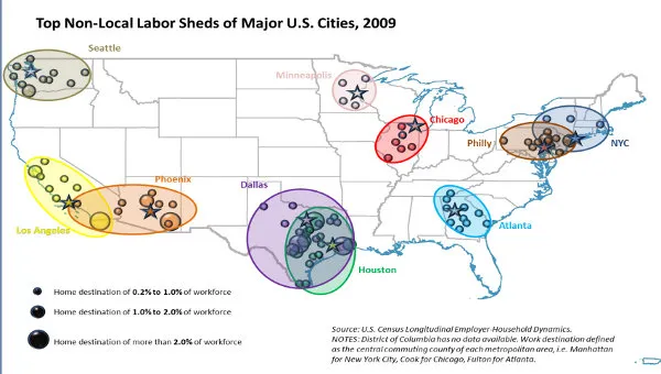 在上面的地图中(来自报告),星星是工作目的地,围绕城市的点代表居住在普查定义的都市区域外的劳动力百分比。