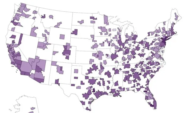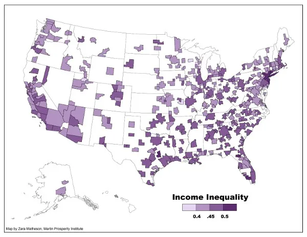 第二张地图(上方)使用基于 基尼系数 的标准收入不平等测量方法绘制了美国城市的收入不平等情况(数据来自美国人口普查局的 2010年美国社区调查)。虽然工资不平等仅考虑薪资之间的差异,但这种收入不平等的测量方法比较所有收入,包括租金、版税和股息。
