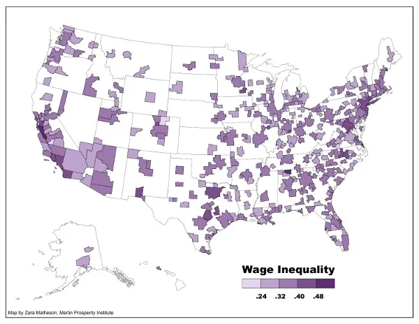 工资不平等的变化相当大,从阿拉巴马州亨茨维尔的0.50和硅谷的圣荷西的0.48,到加利福尼亚州汉福德-科尔科伦和印第安纳州埃尔克哈特-戈申的0.22。