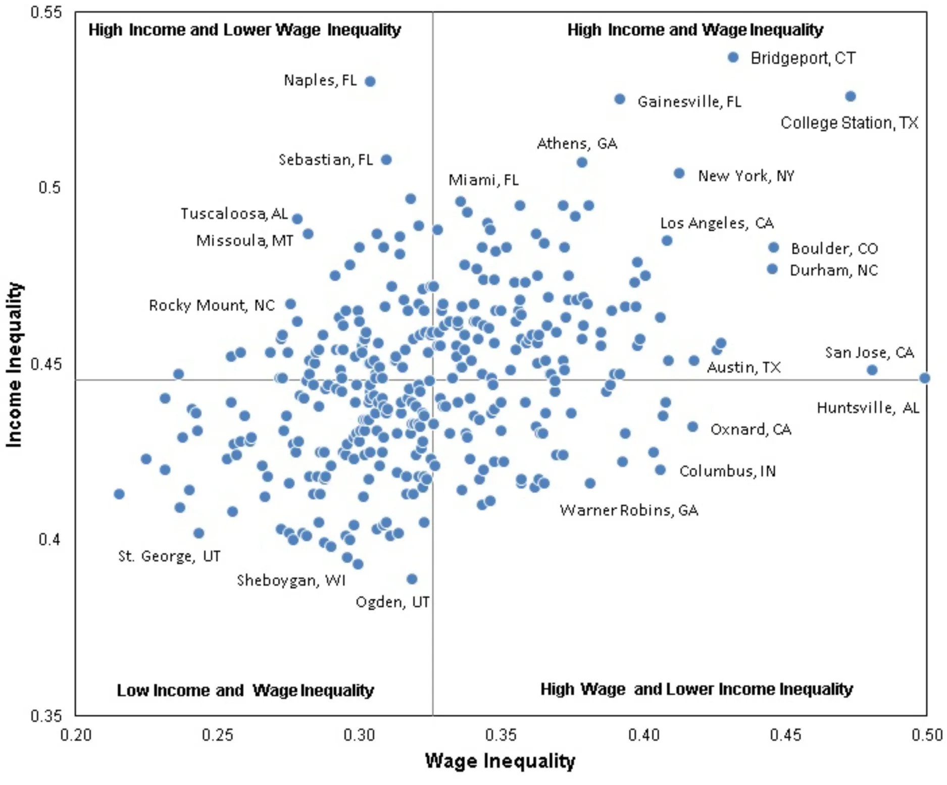上面的图表比较了两个不平等指标的城市,即工资和收入不平等。它分为四个基本象限。位于右上角的城市——布里奇波特、纽约、盖恩斯维尔、大学站和博尔德面临着高收入和高工资不平等的双重打击。右下角的城市——包括著名的高科技集群如圣荷西(硅谷)、奥斯丁和阿拉巴马州的亨茨维尔——在较低的收入不平等水平下,工资不平等水平相对较高。