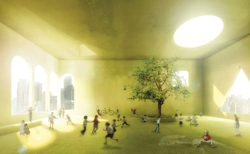 对于这场比赛,提出了关于世界屋顶的想法讨论,纽约被选为实验的案例。作为美国的“教育之都”,这个提问似乎很有意义:“如果突然间教育成为一个社会中最高(且最显著)的价值会怎样?如果有一天所有的摩天大楼顶上都有一所学校呢?”