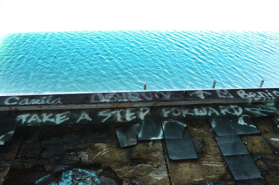 开放式房间边缘的全大写涂鸦写着:“向前迈一步。”这是一种朋克的挑战——向前一步意味着长时间坠入下面的看台——但它也反映了迈阿密海洋体育场历史上的这一时刻。