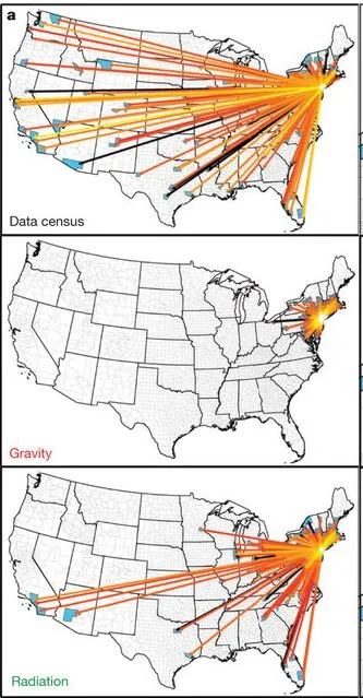 另一个例子集中在从纽约出发的旅行上。同样,“引力法则”(下方中间面板)高估了当地流动性,低估了长距离甚至中距离的流动性。“辐射模型”(下方面板)提供了对普查(上方)观察到的通勤模式的“更现实的近似”,研究人员展示了这一点: