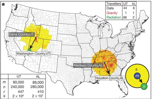 因此,辐射模型在直接竞争中超越了“引力法则”。作为一个例子,研究人员观察了犹他州和阿拉巴马州两个县之间的流动性。两个起始县的人口相似,两个目的地县的人口也相似,并且这两个县之间的距离大致相等。实际的普查数据显示,犹他州有44人通勤,而阿拉巴马州有六人。