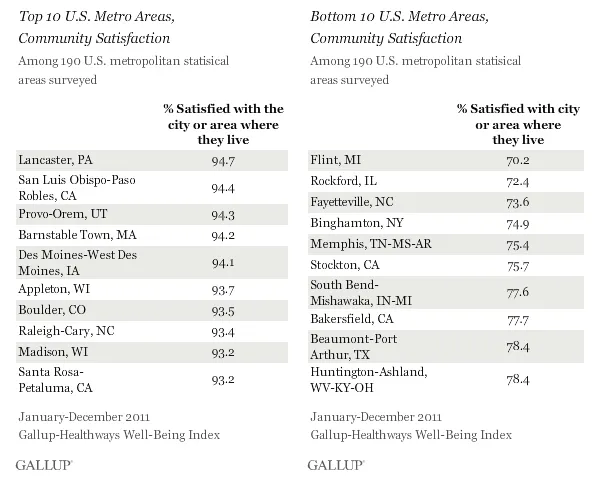 第二张表(上面)显示了社区满意度排名前十和后十的城市。宾夕法尼亚州的兰开斯特位居榜首,名单中还包括加利福尼亚州的圣路易斯奥比斯波、犹他州的普罗沃、马萨诸塞州的巴恩斯特布尔和爱荷华州的得梅因。相反,密歇根州的弗林特、伊利诺伊州的罗克维尔、北卡罗来纳州的费耶特维尔、纽约州的宾汉姆顿和田纳西州的孟菲斯则是社区满意度最低的十个城市之一。
