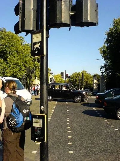 飞马过街道: 一种专为马匹设计的人行横道,配有一个位于几米高的按钮,因为根据法律,每位英国公民必须拥有至少一只会飞的飞马。