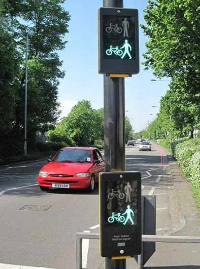 双鸟过街道:从名字上可以轻松猜测——“双鸟”过街,明白了吗?——这种类型的斑马线是为行人和骑自行车的人设计的。这里有一张来自维基百科用户的照片 man vyi: