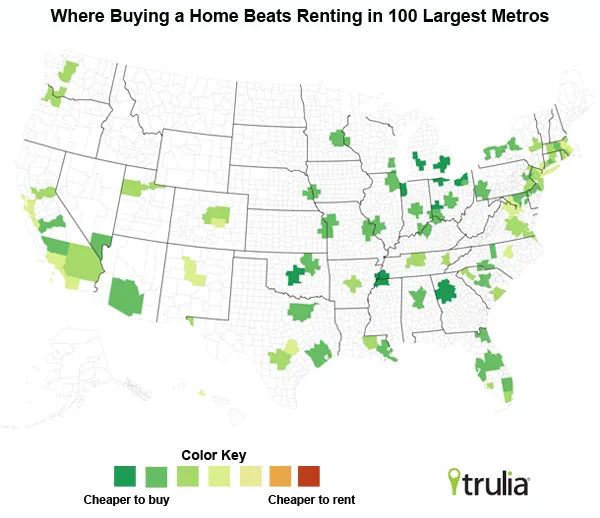 路透社在美国100个最大都市区中,现在购买房屋的成本低于租房的成本。根据 Trulia 2012年冬季租房与购买指数,多年的泡沫后价格下降,加上稳定或上升的租金,导致全国的价格与租金比率下降。该指数通过查看Trulia.com上类似属性和相似社区的出租和待售房屋的要价,跟踪租房或购房的相对可负担性。